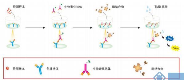 Solarbio (Solarbio ®) ELISA 试剂盒采用基于双抗体夹心法的酶联免疫吸附检测技术。将抗人 IL-11 单克隆抗体包被在酶标板上;分别加入梯度稀释的标准品和预稀释的样本,标准品和样本中的人 IL-11 会与酶标板上的包被抗体充分结合;洗板后加入生物素化抗人 IL-11 抗体,该抗体会与板子上包被抗体捕获的标准品和样本中的人 IL-11 发生特异性结合;洗板后加入辣根过氧化物酶(HRP)标记的链霉亲和素,生物素与链霉亲和素会发生高强度的非共价结合;洗板后加入显色剂底物 TMB,若反应孔中样品存在不同浓度的人IL-11,则 HRP 会使无色 TMB 变成不同深浅(正相关)的蓝色物质,加入终止液后反应孔会变成黄色;最后,在λmax=450 nm(OD=450 nm)处测定反应孔样品吸光度(OD),样本中的人 IL-11 浓度与 OD 成正比,通过绘制标准曲线和四参数拟合软件便可计算出样本中人 IL-11 的浓度。